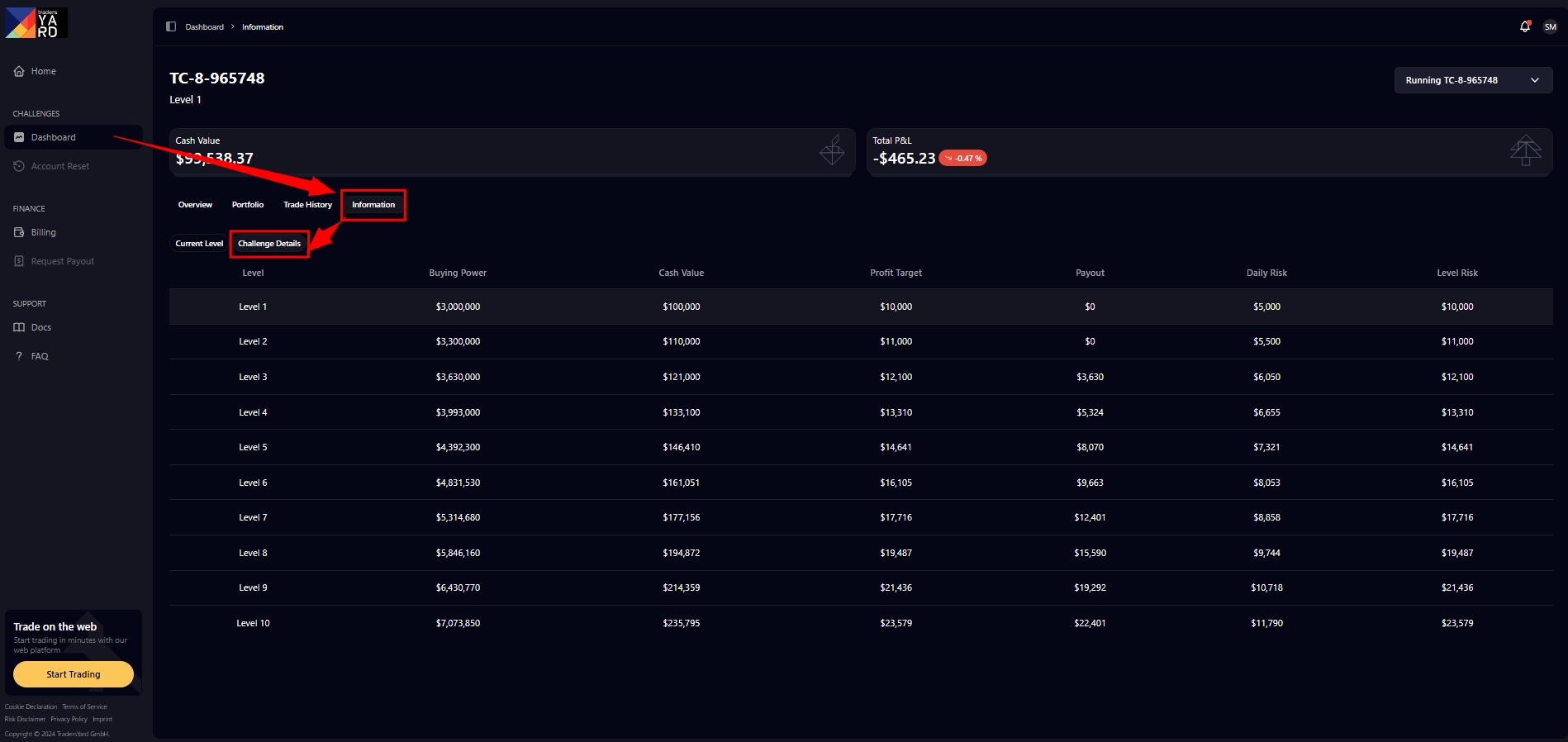 Alle Details zur Account-Skalierung findest du in deinem Dashboard unter: Dashboard -> Information -> Challenge Details