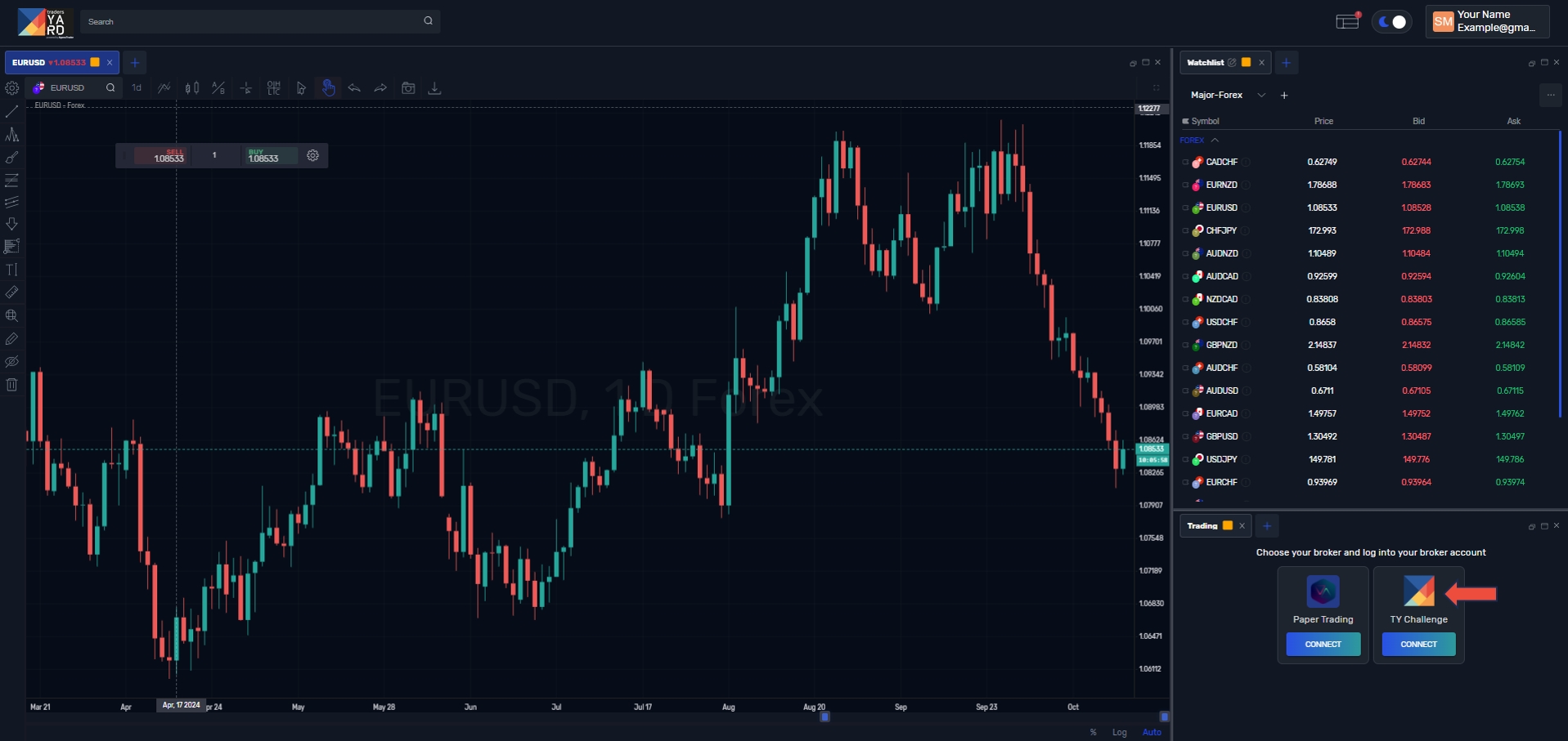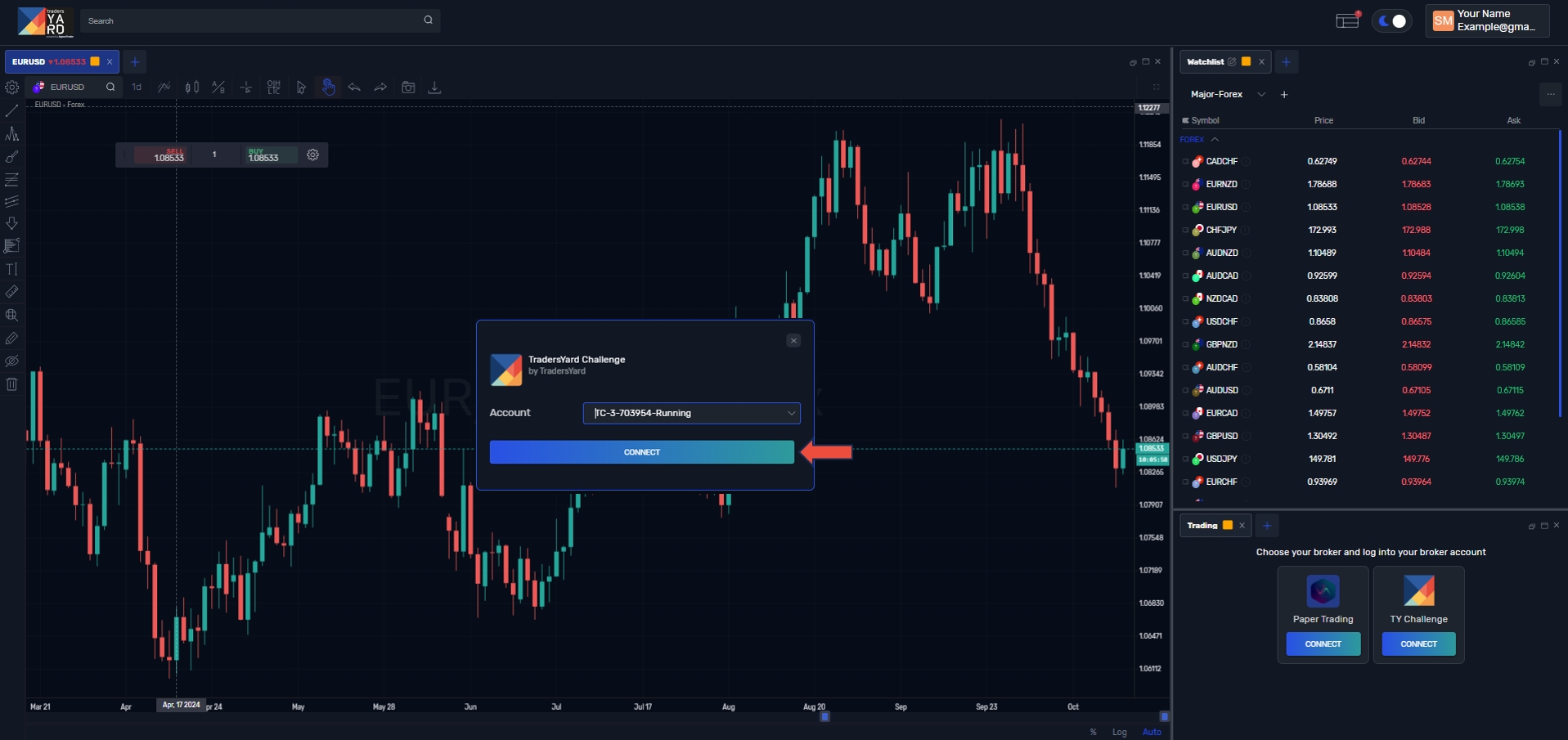 Gehe im Trading-Tab auf die Option TY Challenge, um dein TradersYard Challenge-Konto zu verbinden. Klicke dort auf Verbinden.
