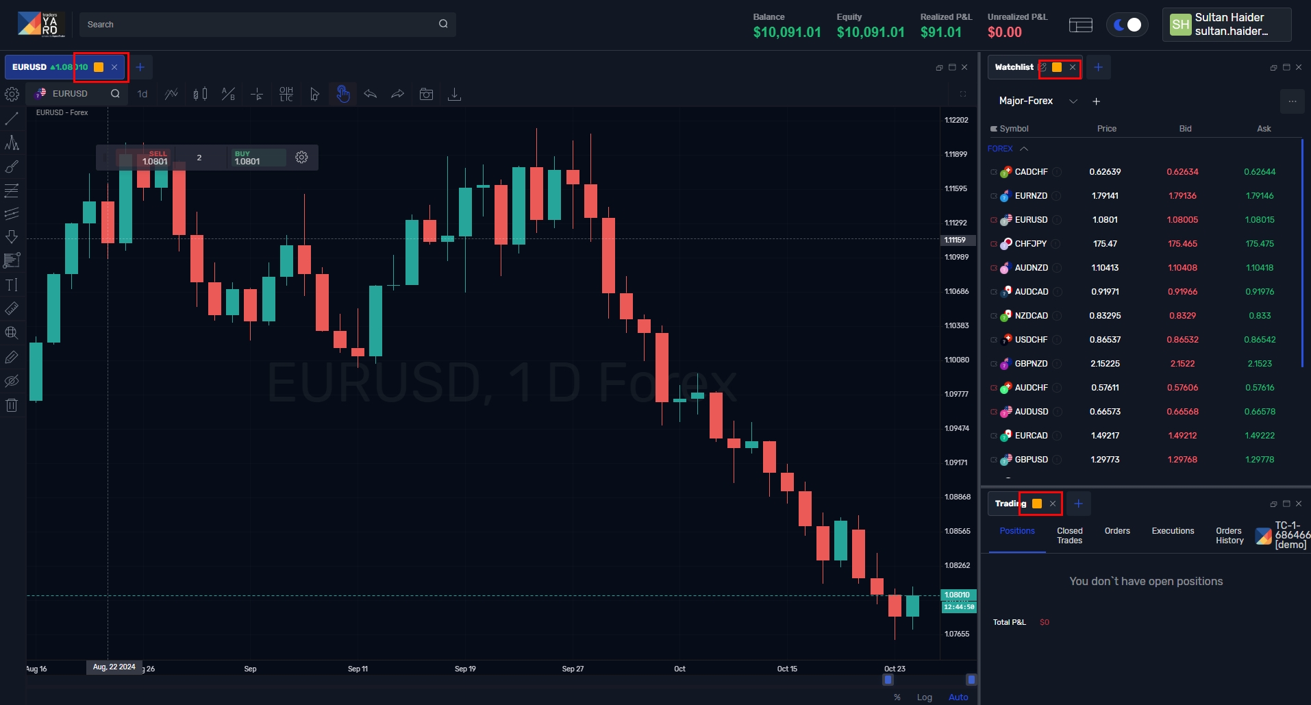 Kliknięcie EURUSD na liście obserwacyjnej spowoduje automatyczne otwarcie jego wykresu w powiązanej zakładce wykresu.