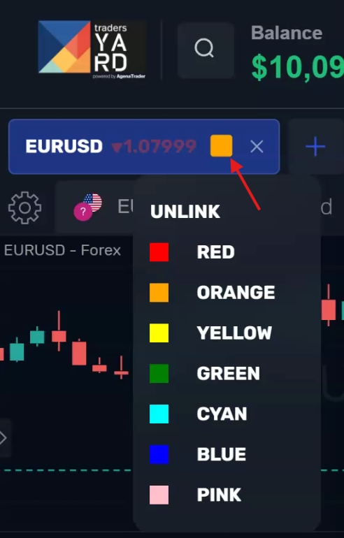 W TY WebTraderze możesz również łączyć różne elementy, przypisując im różne kolory. Zakładki połączone tym samym kolorem będą działały razem, co zwiększa efektywność i ułatwia pracę.
