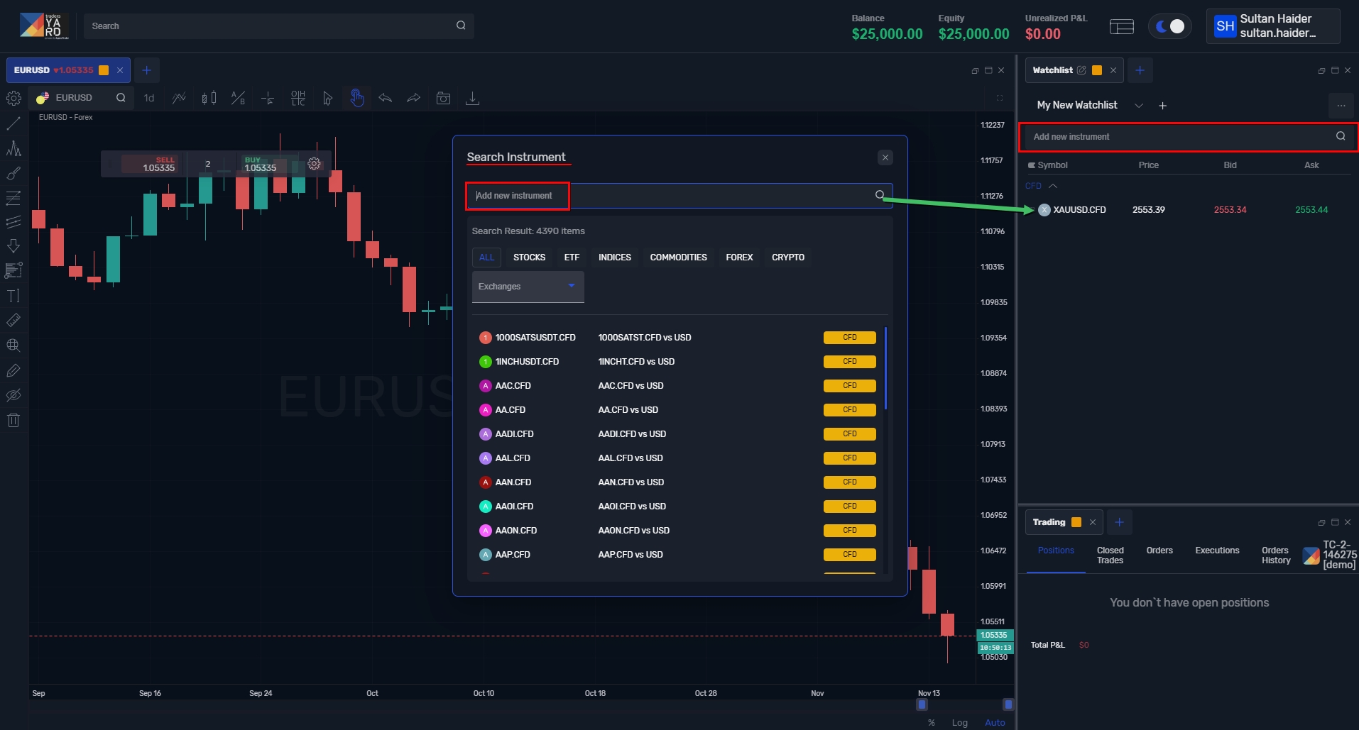 Wpisz symbol instrumentu, a następnie kliknij go na liście wyników, aby dodać do ulubionej listy obserwacyjnej.