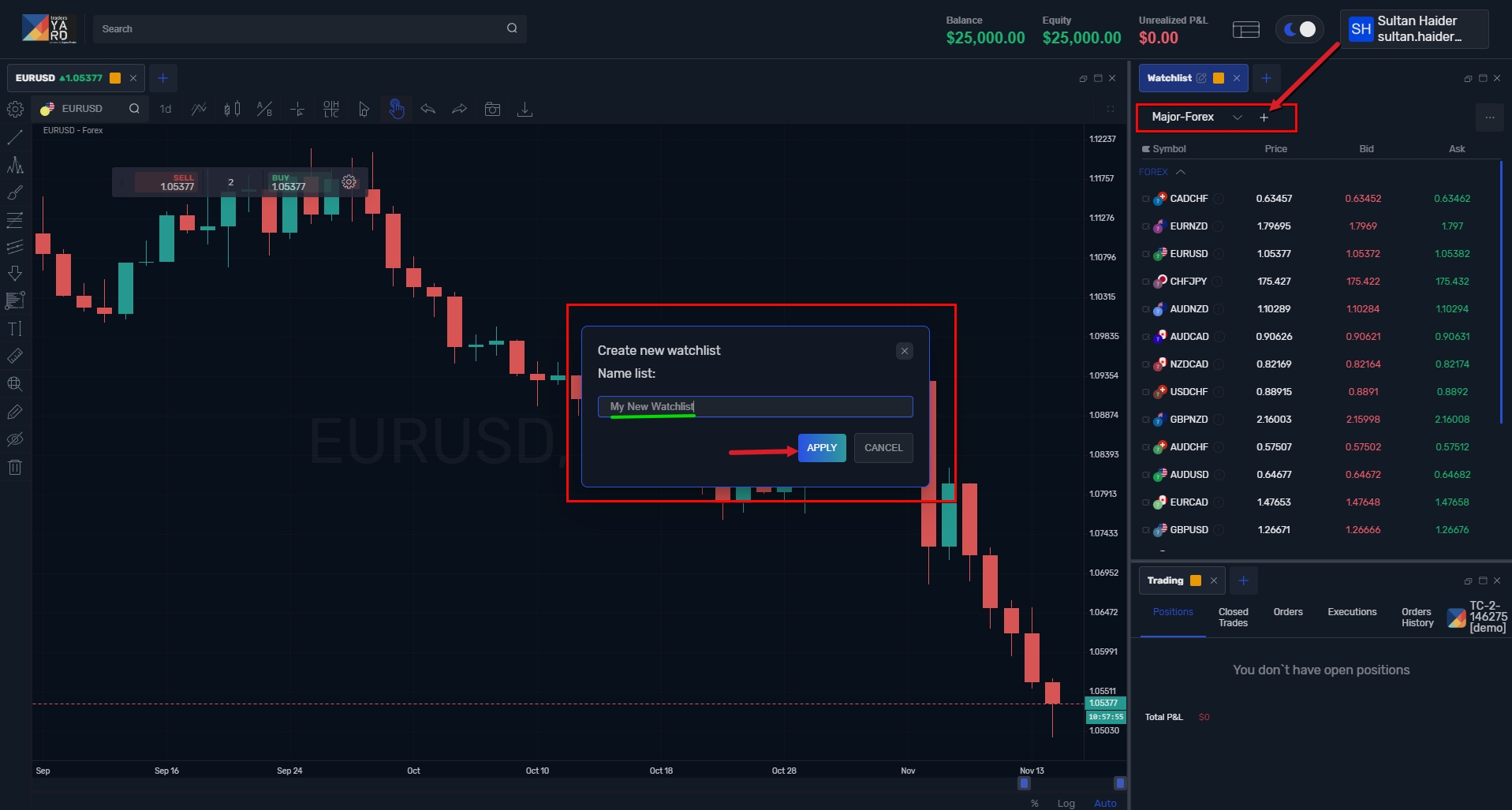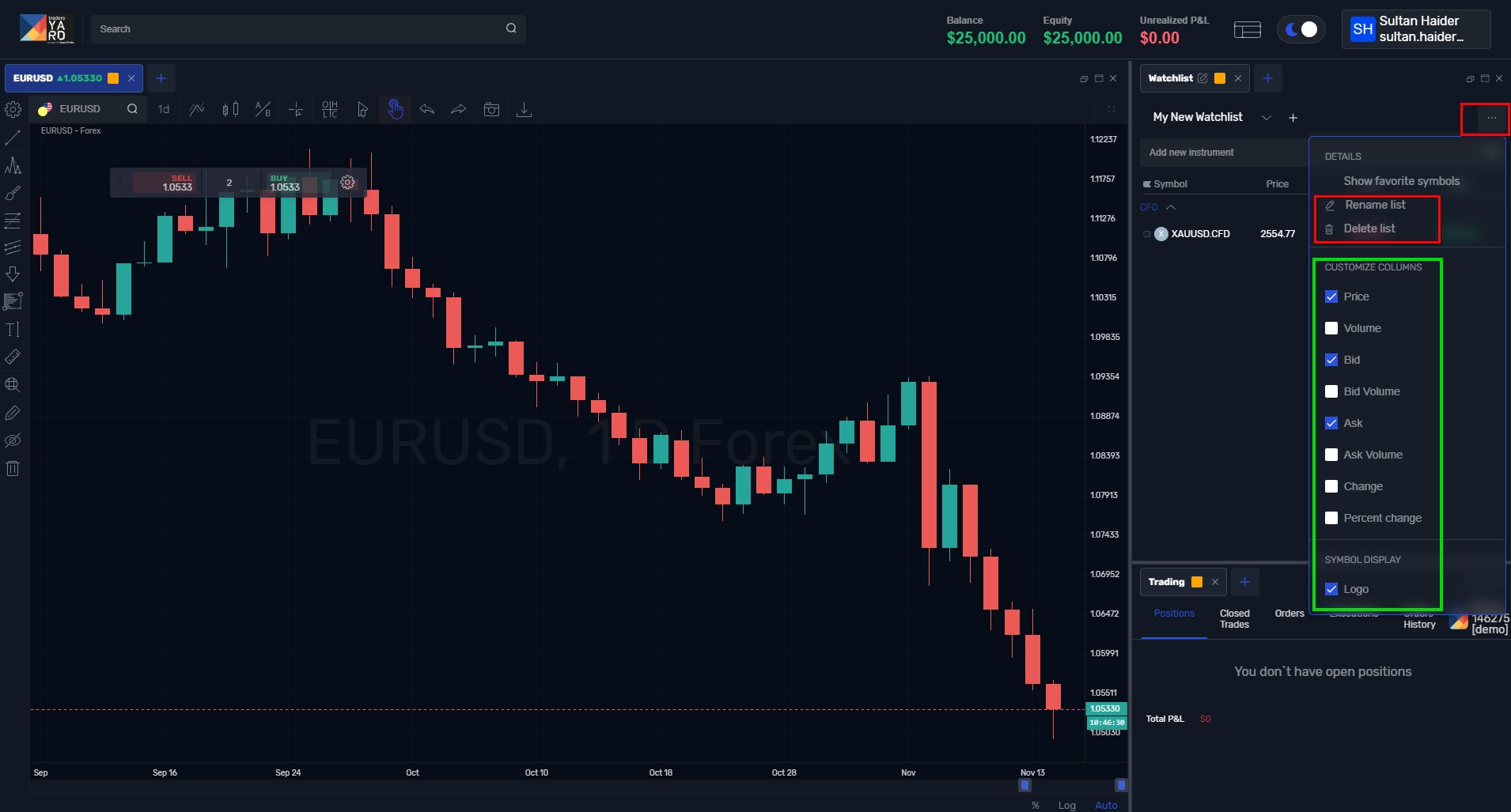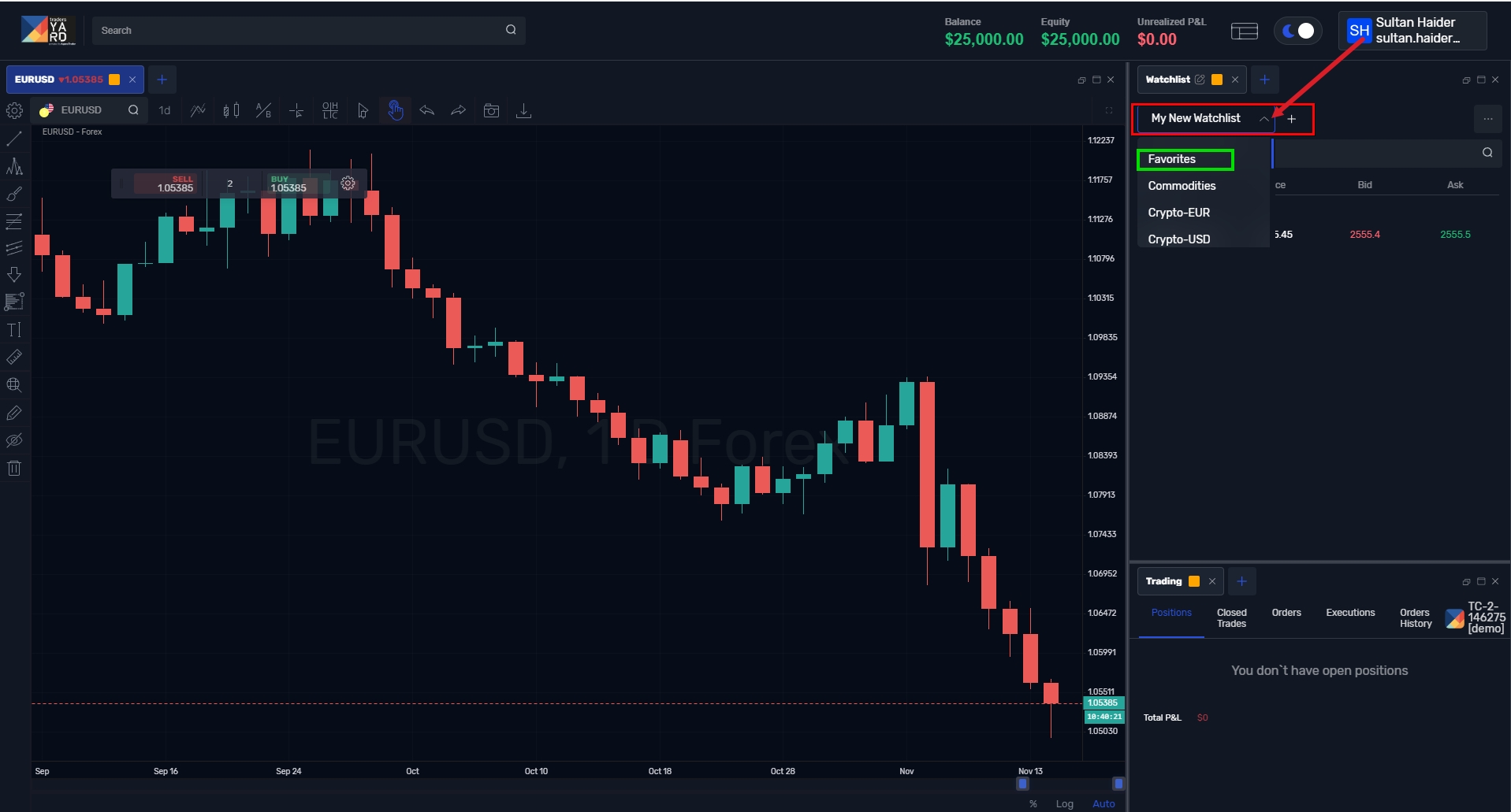 Domyślnie TY WebTrader oferuje gotowe listy obserwacyjne, ale możesz również tworzyć własne, niestandardowe listy oraz listę ulubionych, aby śledzić swoje ulubione instrumenty.