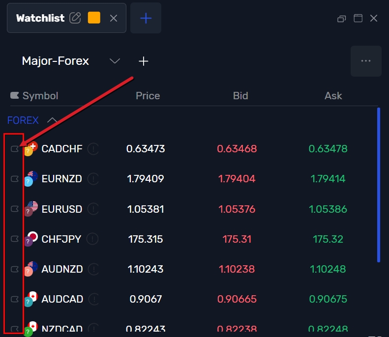 Domyślnie w TY WebTrader dostępna jest ulubiona lista obserwacyjna, która początkowo jest pusta. Możesz dodawać do niej swoje ulubione symbole w następujący sposób: