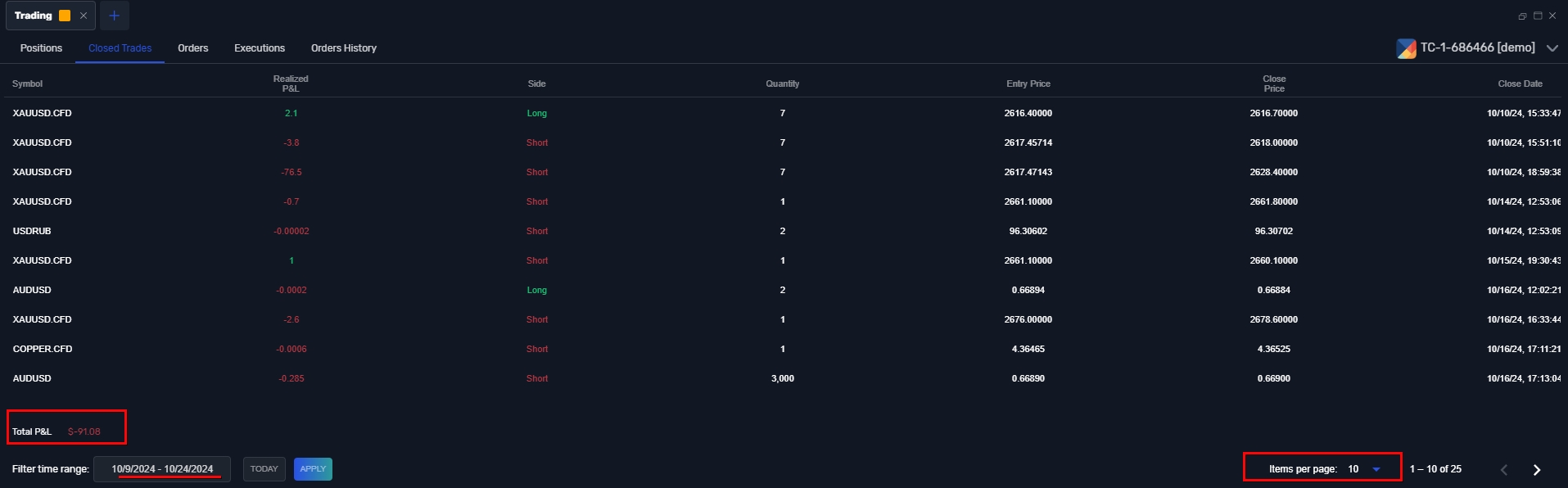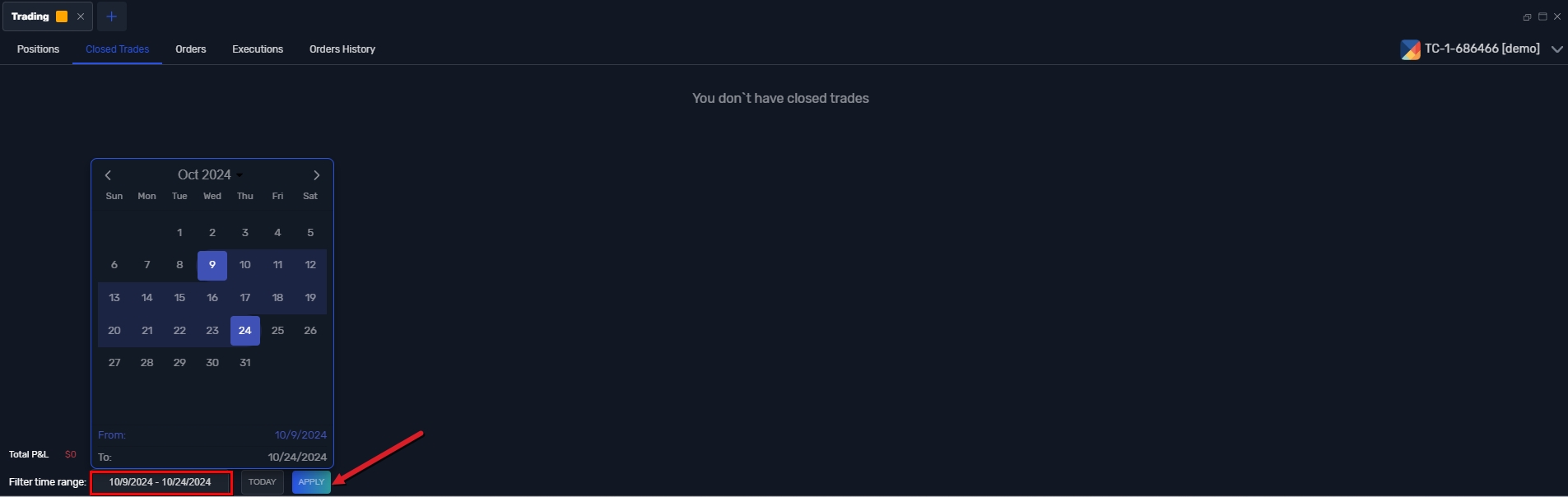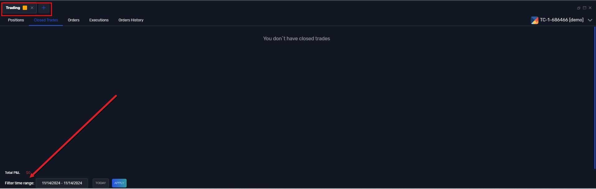 Aby zobaczyć szczegóły transakcji z określonego okresu, możesz zastosować filtr zakresu czasowego w sekcjach "Closed Trades", "Executions" i "Order History"